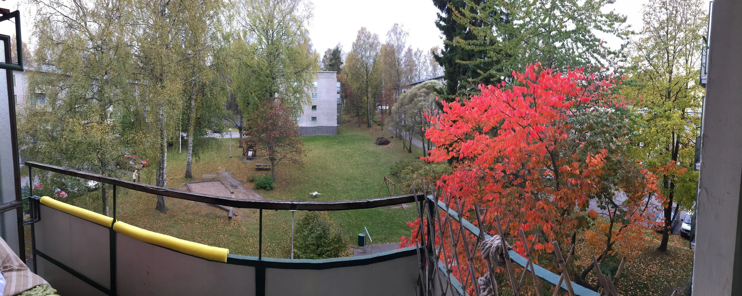Bonus pic, early autumn panorama... note the pool noodles, which provide cushiony comfort for our feet when we recline on the couch. :)